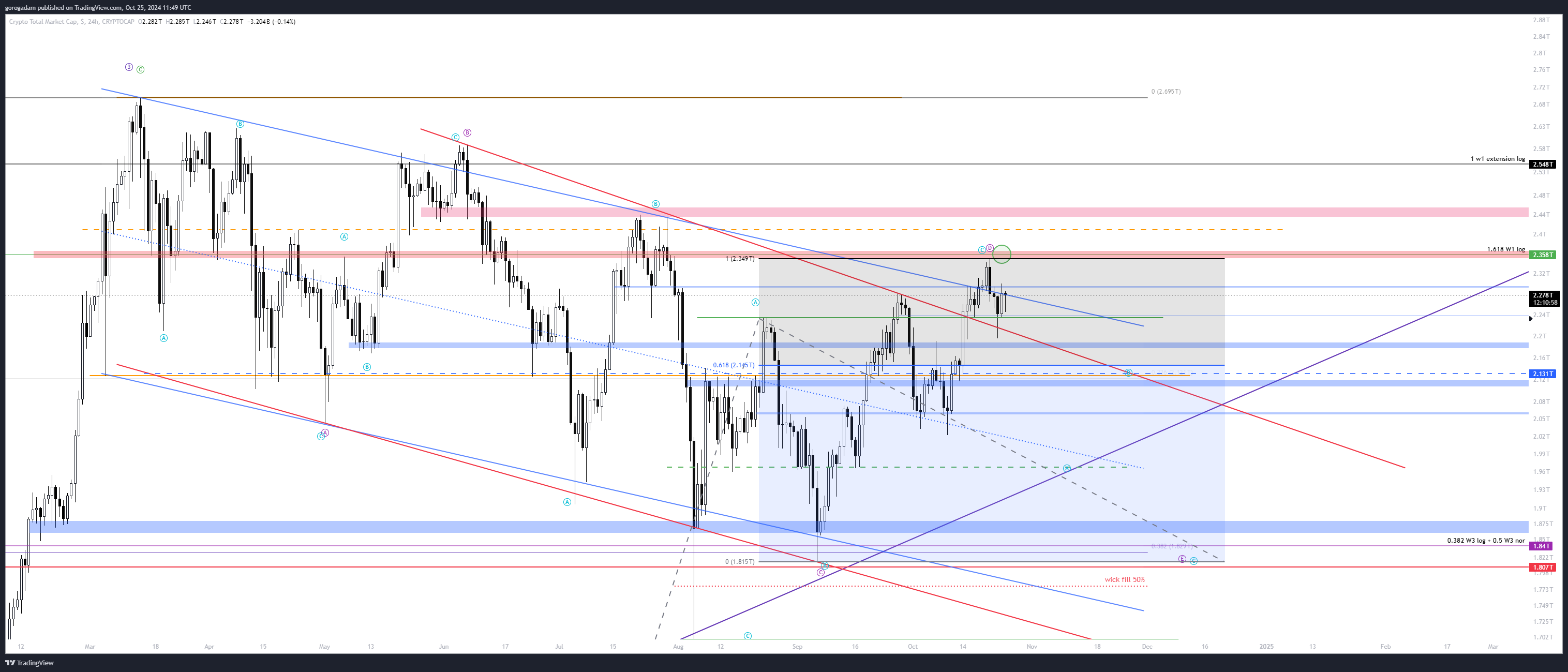 TOTAL elemzés – HTF helyzet: (megj: a csatolt chart logaritmikus, de azz Elliot Wave extension tool normálra lett állítva, mert így jön látszik pontosan a feltételezett csúcspont kimérése)