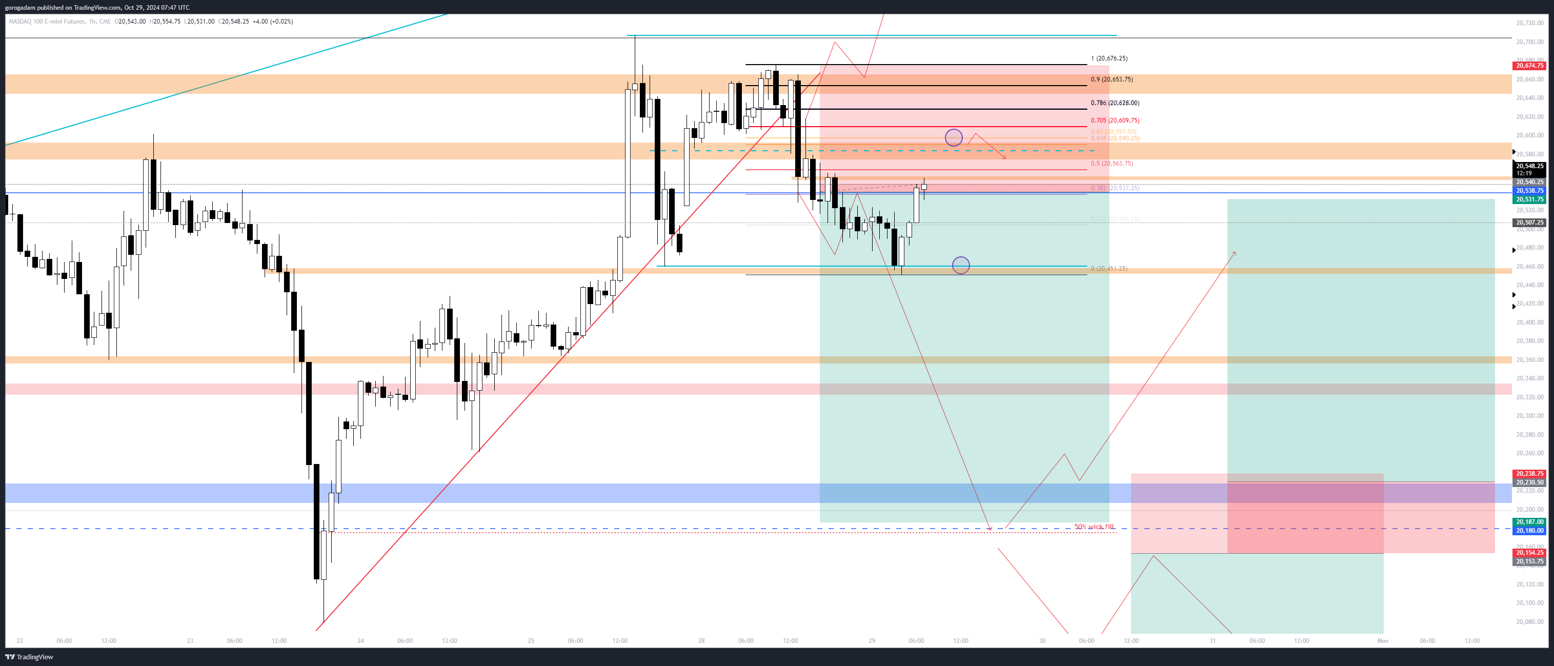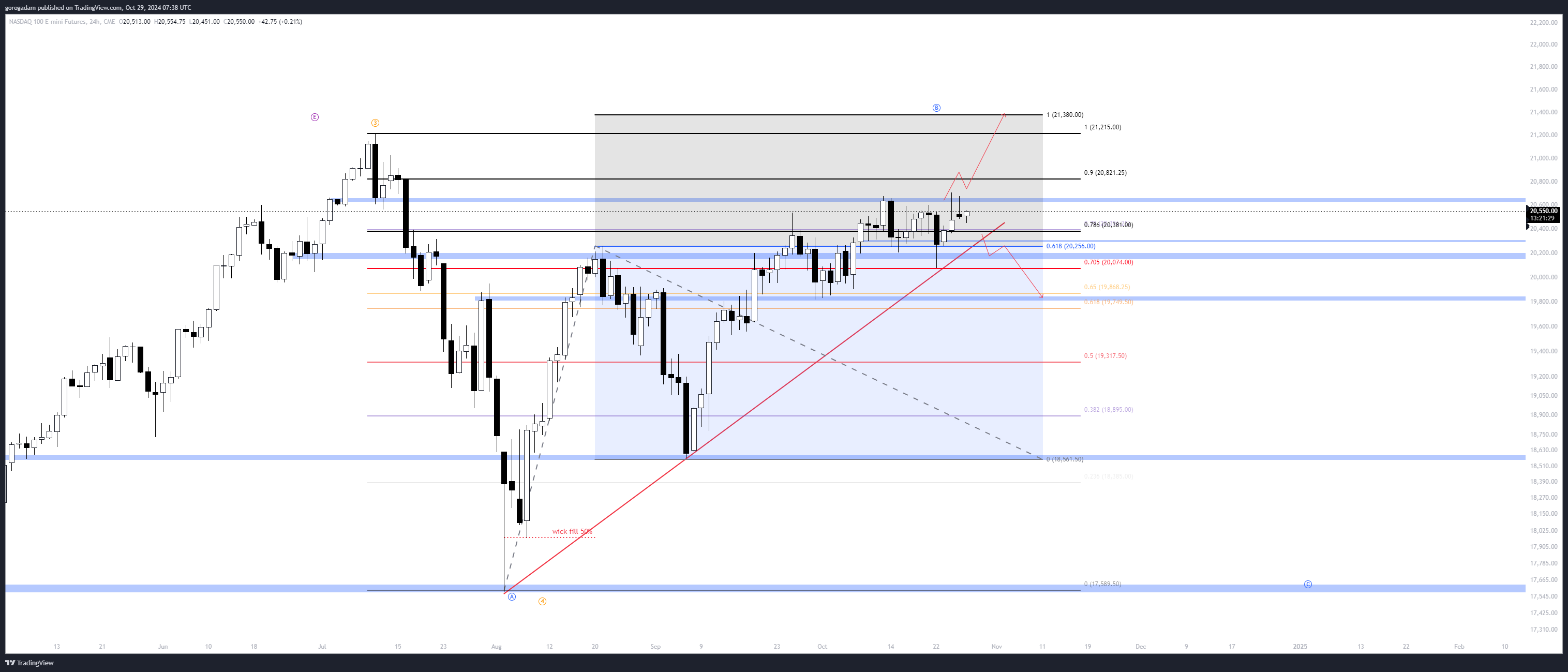 20 680 felett valószínű az irány 21 400-ig, míg a 20 538-as szint elvesztése jó short helyzetet teremtene 20 180-ig, ami a kék zóna midrange és a szerdai napos kanóc 50%-os szintjének betöltése is.