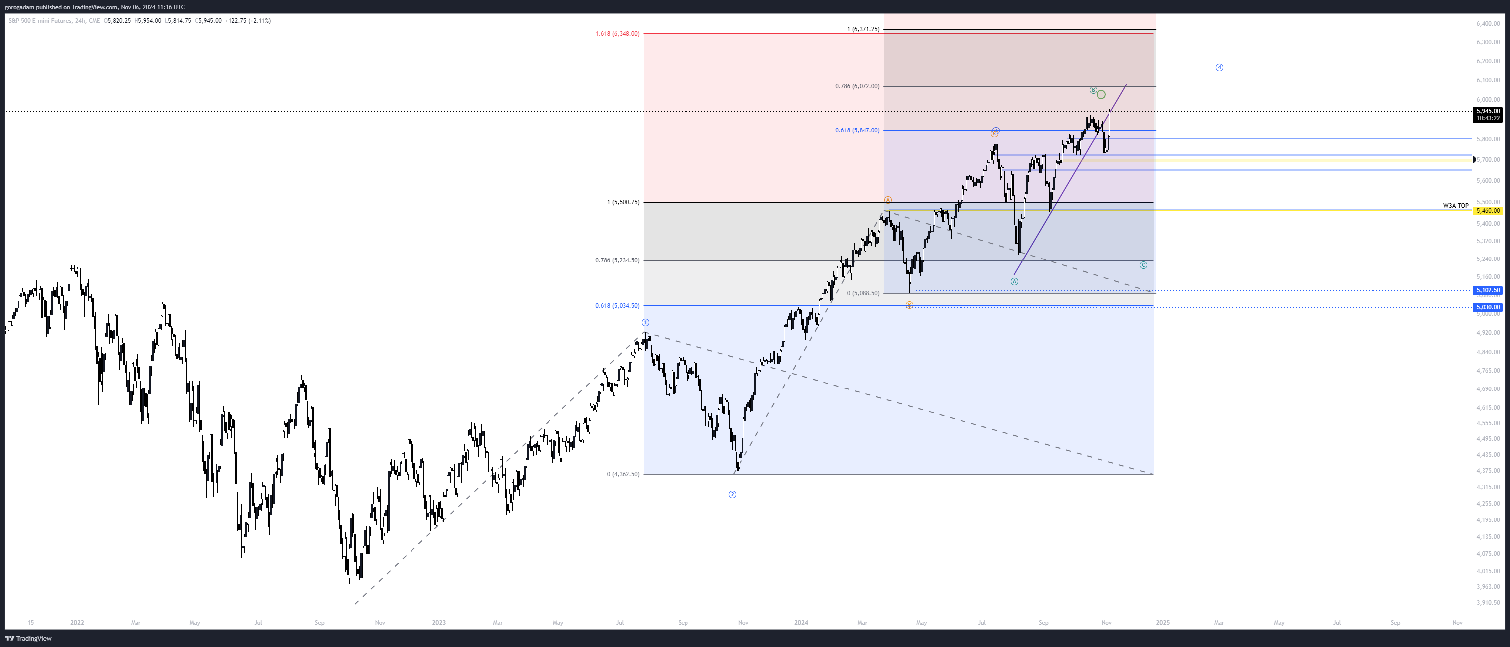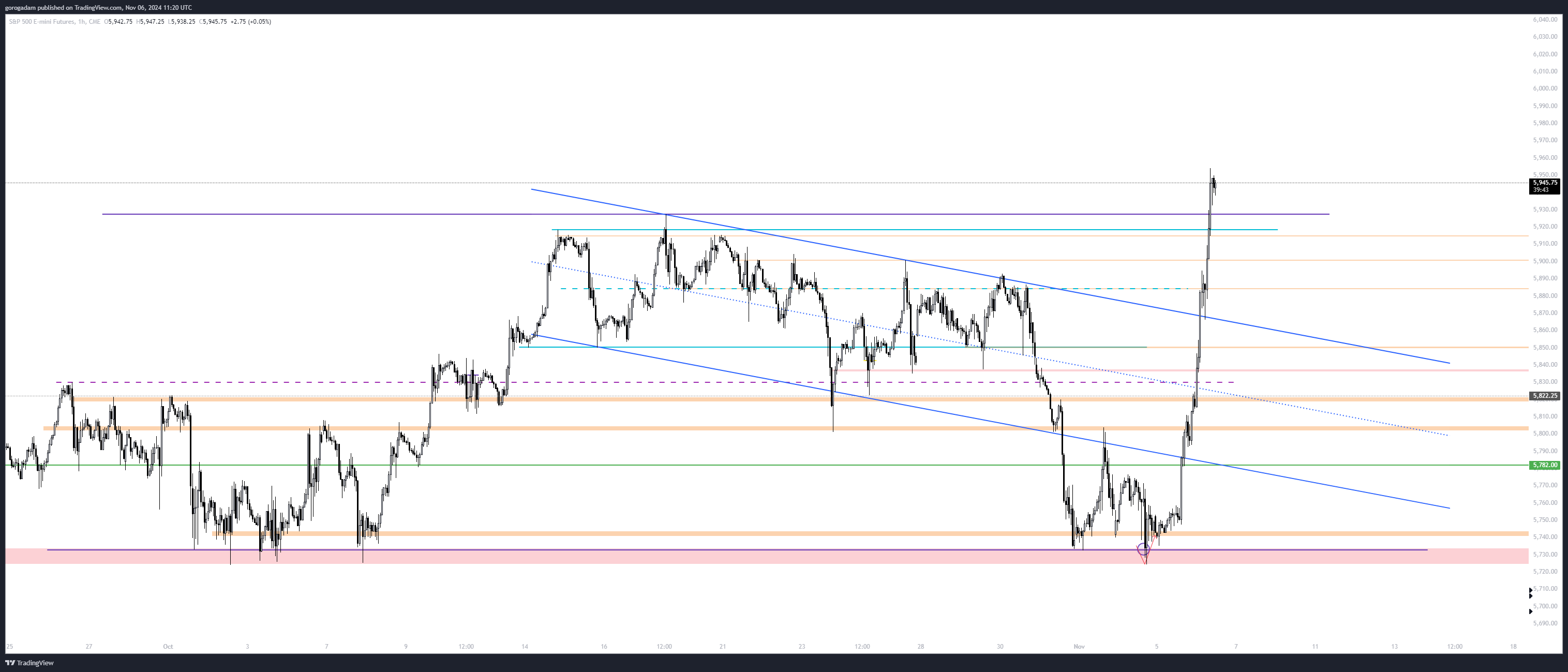 S&P 500 elemzés – INTERDAY: a Trump győzelem miatt mind a részvények, mind a kriptó felszaladt a zónájuk tetejéig. Ez továbbra is egy no-trade állapot nekem (kivéve a hétfői tervben mutatott long tartását), de érdemes átgondolni néhány szkenáriót, egyelőre elméletben.