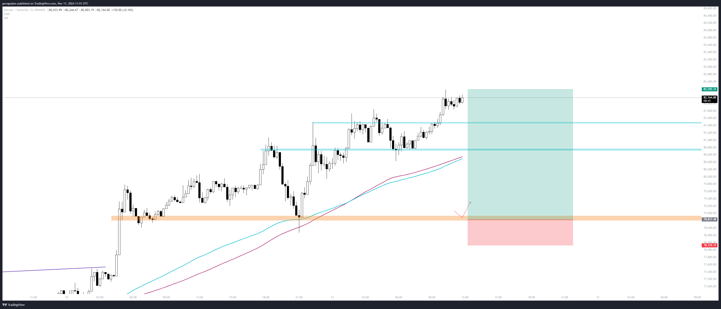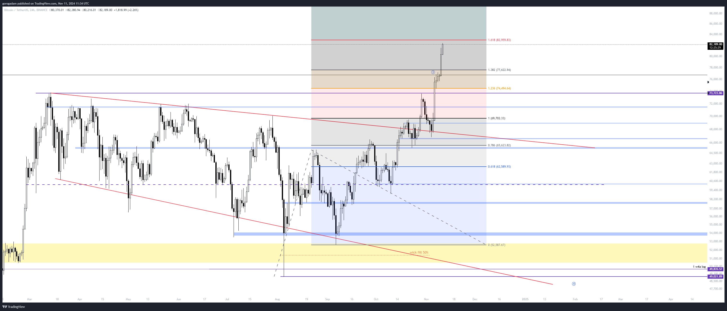 BTC elemzés – INTERDAY: közeledik a BTC a lehetsége 82 900-as célárhoz, és semmi akadálya nem kéne, hogy legyen, hogy ezt elérje, a korai shortokat büntetve a kései longok helyett.