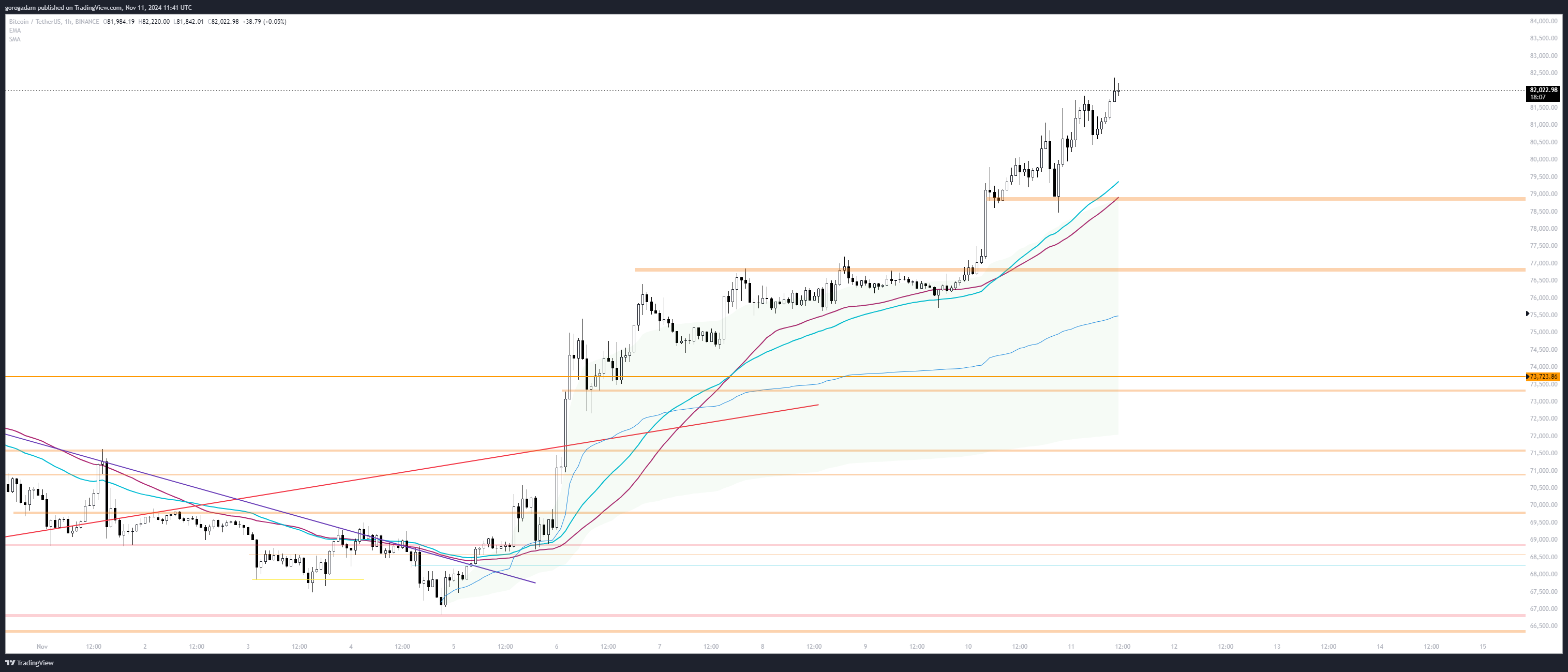 78 900 dollár lehetne az első támasz, aminek az elesése figyelmeztető jel lehet, de egyelőre még messze vagyunk tőle, hiszen erős uptrendben vagyunk, és az órás mozgóátlagok is trendként szolgálnak.