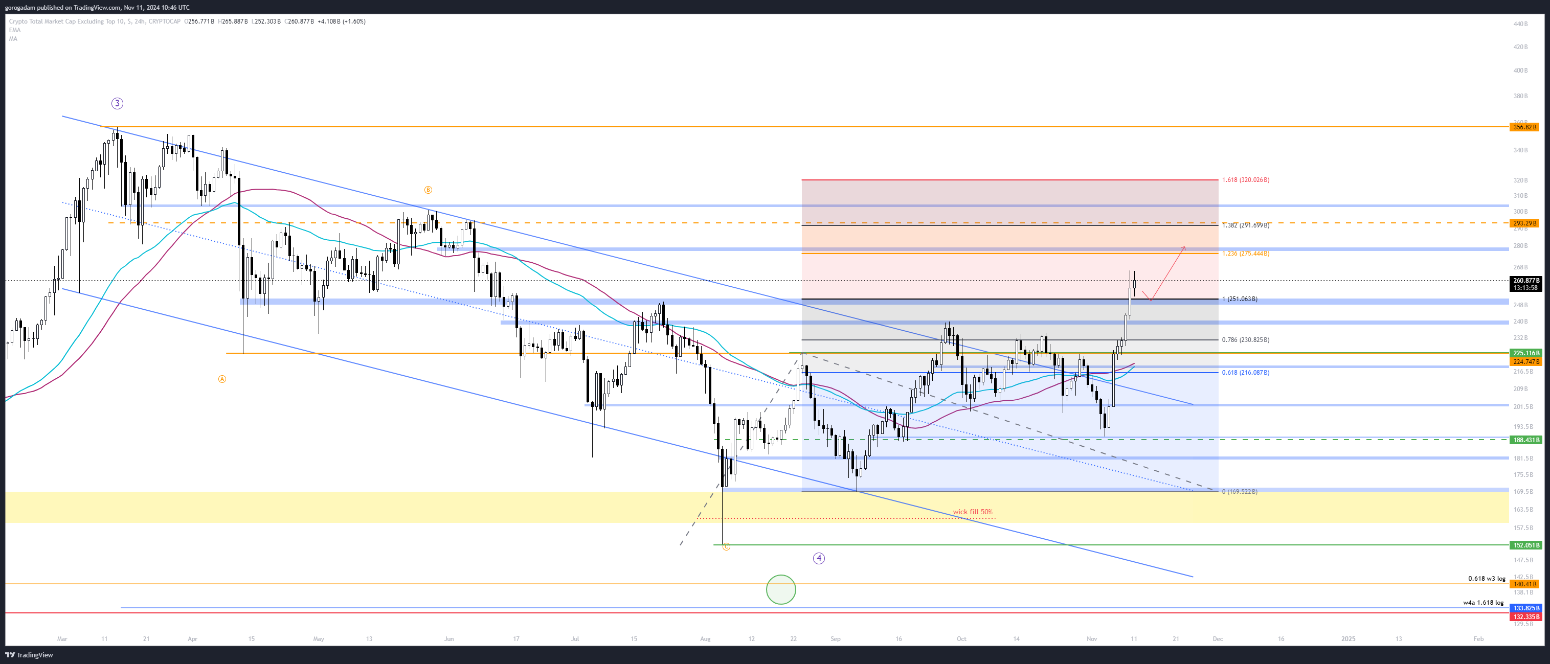 ez azt jelentené, hogy az 1.618-as szintnél (logaritmikus) véget érhet az első hullám, majd korrekció jön, és onnan indul a harmadik alhullám, ami a legintenzívebb (és várhatóan altszezon lenne)