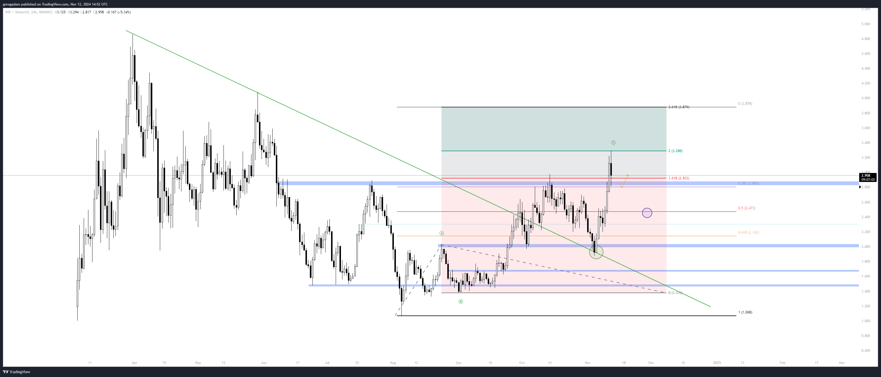 Másrészt viszont lehetséges, hogy megvolt már a mozgása, bár simán lehet, hogy nem, és megy tovább a 2.618-as extenzióig. A 3.288$-os szint áttörése mindenképp jó long lehetőség 3.879$ig (amia 2.618-as extenzió normál charton).