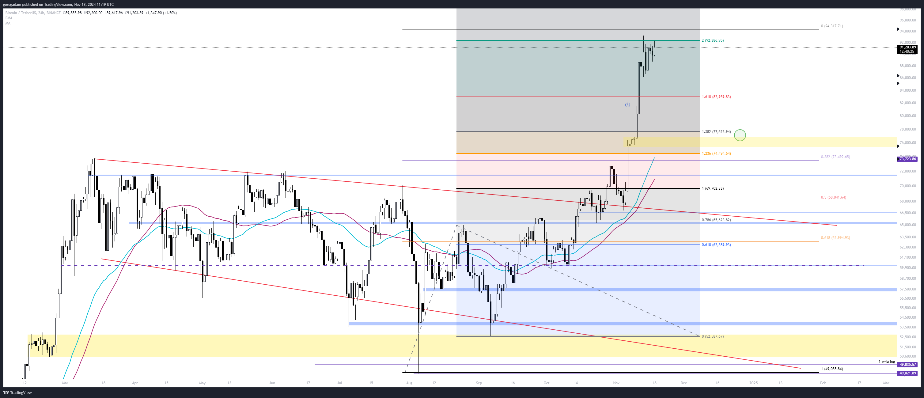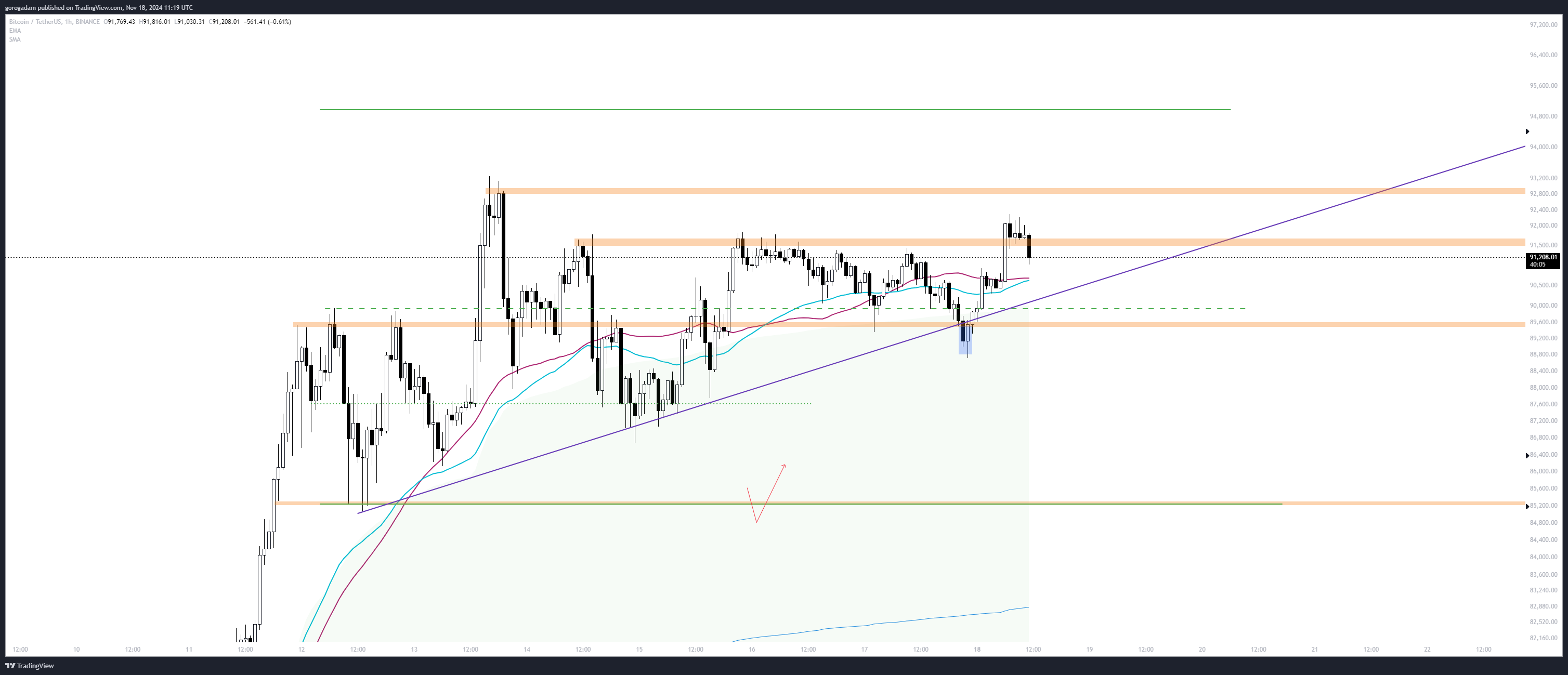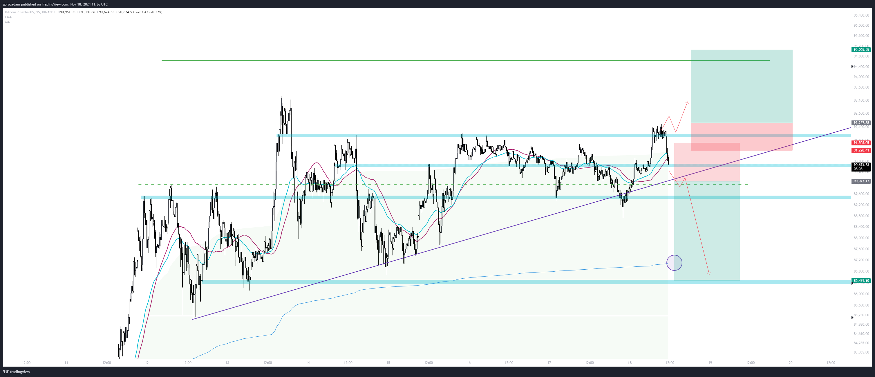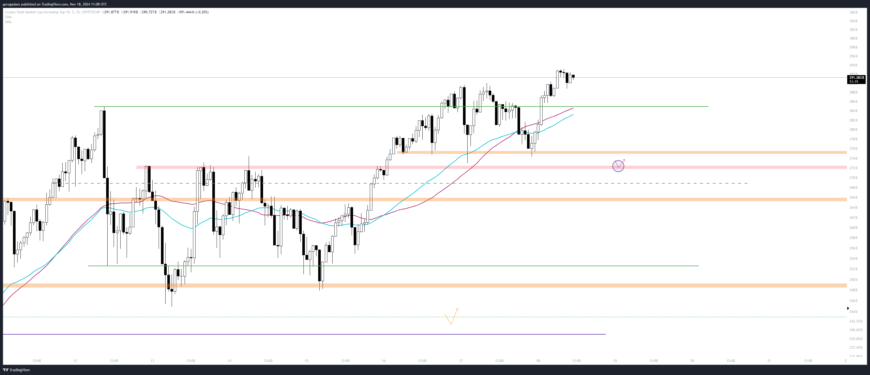 Érdekes, hogy vasárnap már deviált egyet az árfolyam a lila trendvonal alá (nem volt meg az erő azonnal pattanni), tehát könnyen lehet, hogy ezt már nem védenék olyan komolyan, és a lila trendvonal elvesztése egy láncreakciót indíthat el a zóna aljáig, kiütve a felhalmozódott likviditást.