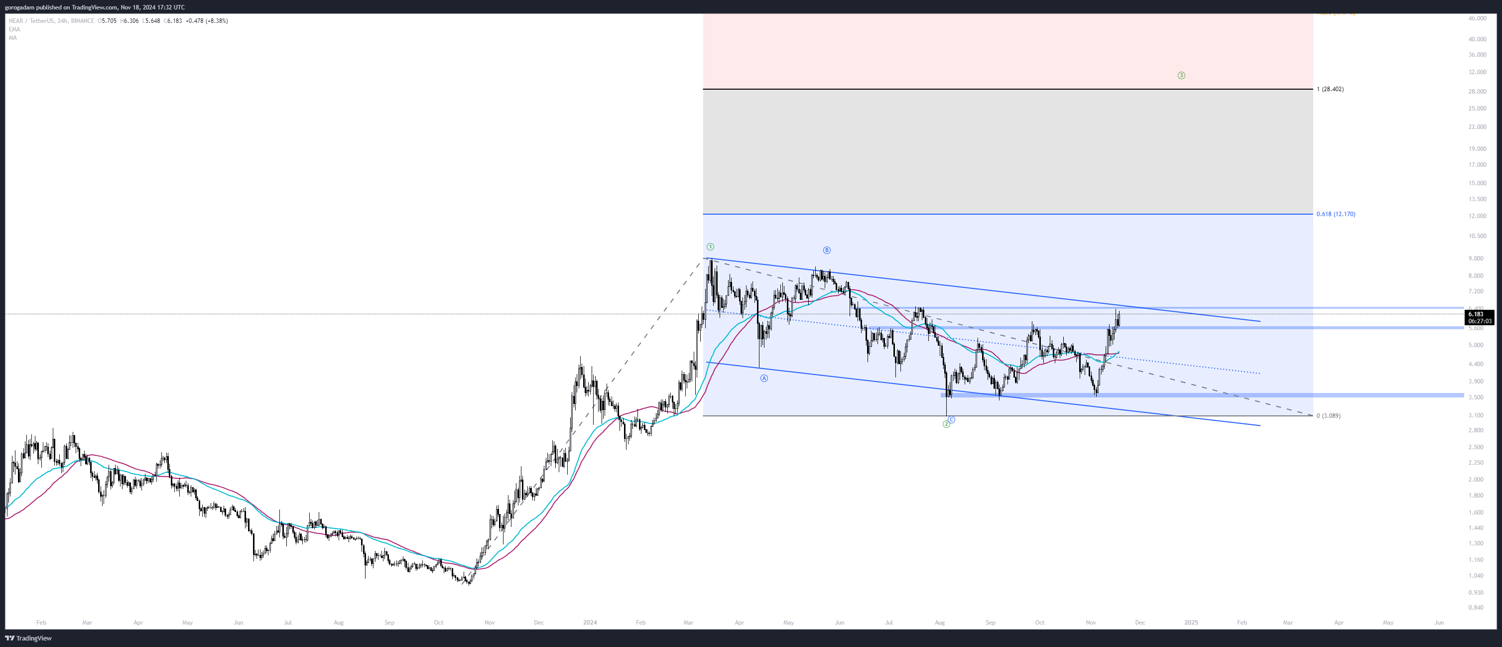 NEAR elemzés – INTERDAY: a NEAR főleg azért érdekes, mert 2023 októberében csinálta meg az alját (ellentétben egy csomó alttal, ami a BTC első felfutása alatt is jól ment, és a visszaesés során magasabb aljat csinált).