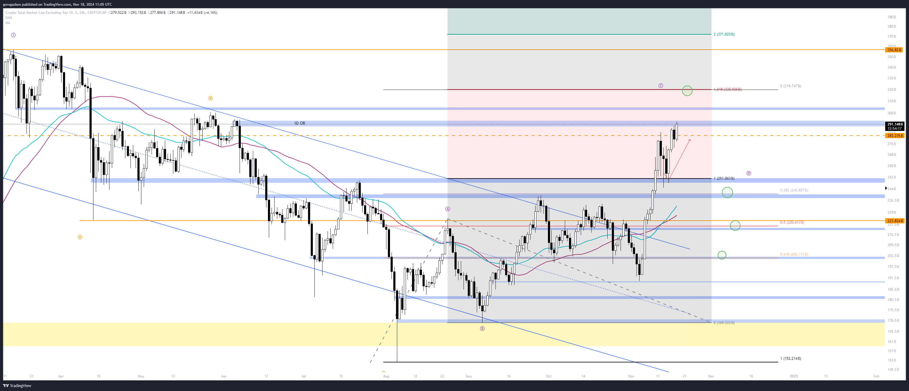 2.056T: kulcsfontosságú napos szint, egyben 0.382-es FIB szintje a III. hullámnak normál charton – ha most elveszti az árfolyam, akkor szvsz célozhatjuk a 0.5-ös FIB szintet (1.85T)