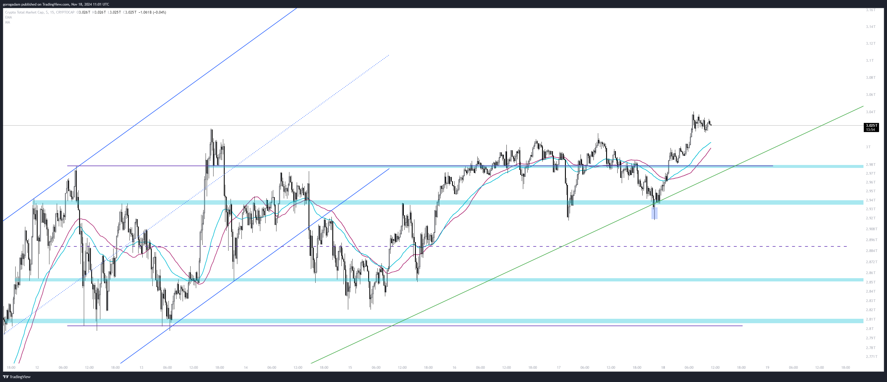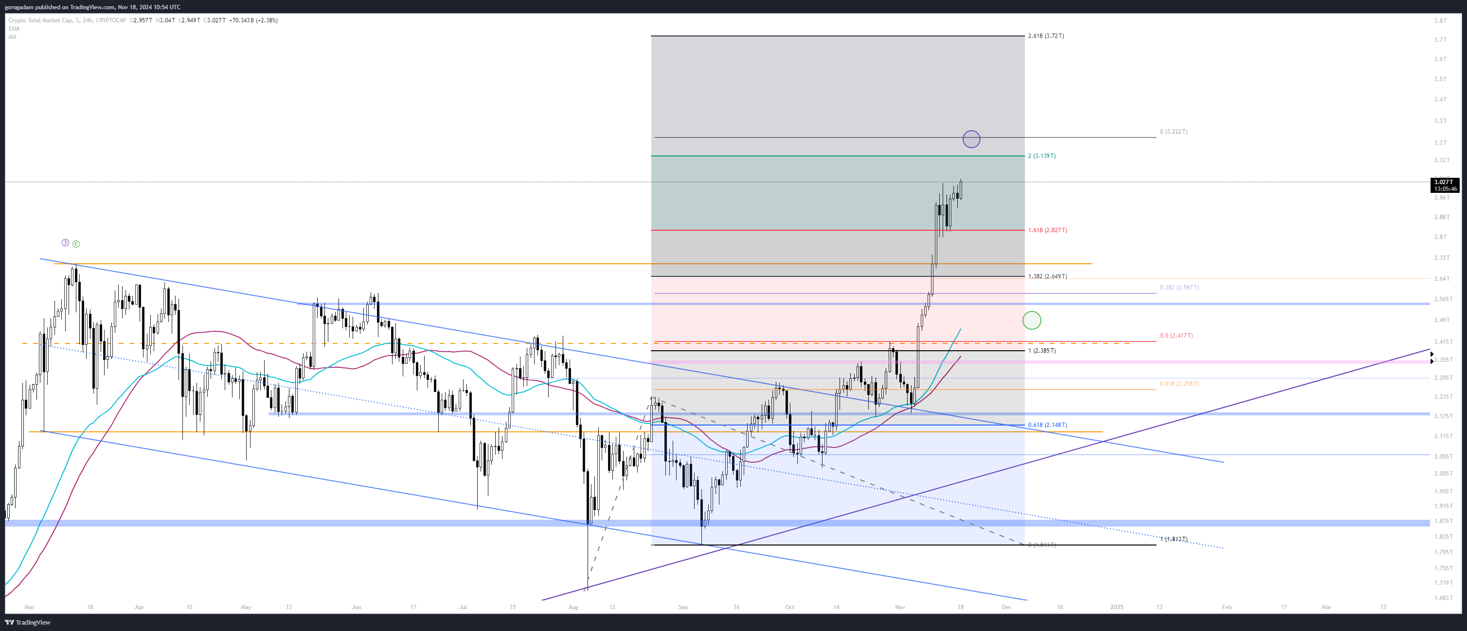 TOTAL elemzés – INTERDAY: sikerült ma áttörtnie az előző csúcsot, így várhatóan halad tovább felfelé, elérve az általam várt 3.22T körüli szintet a héten valamikor.