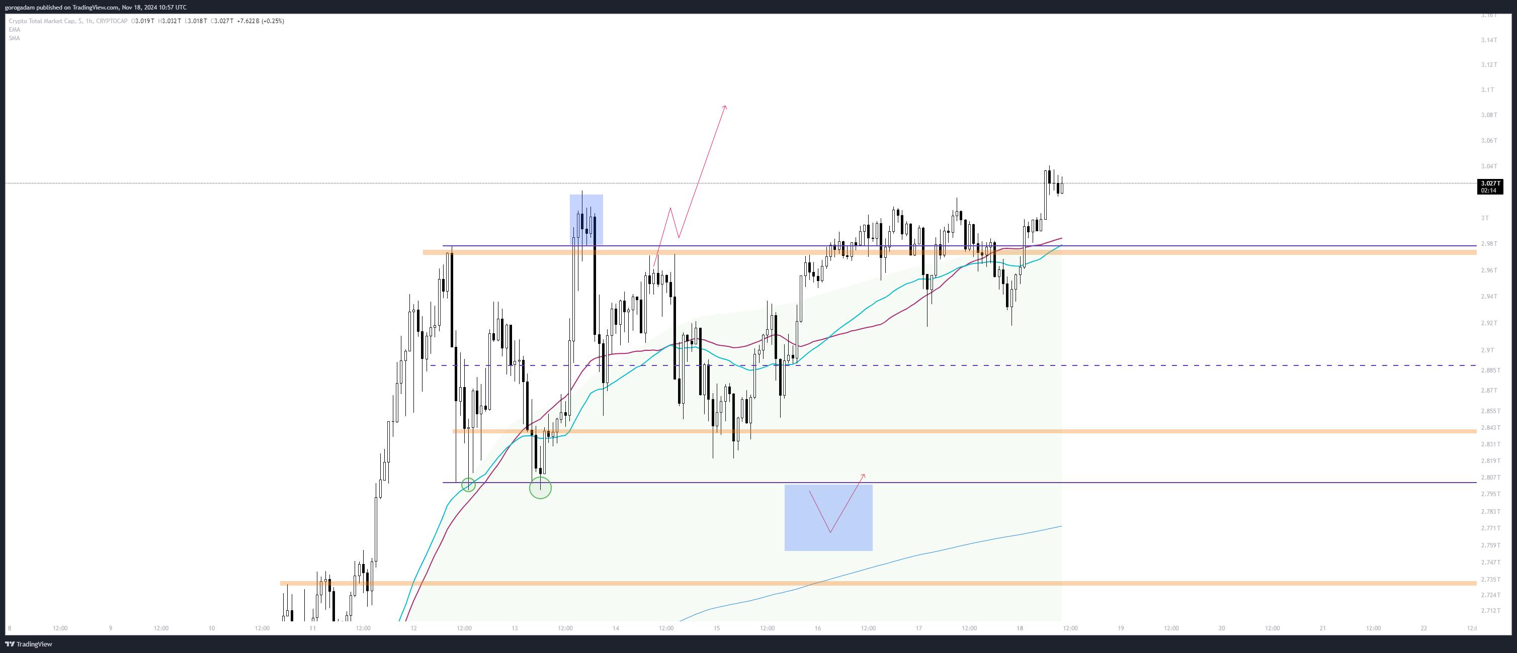 A 2.827Ts szint kialakult, mint napos támasz, ennek az elvesztése majd ellenállássá alakulása lenne a jele a korrekció kezdetének, ettől ugye messze van jelenleg, amíg meg nem történik addig az esések jó long lehetőségek.