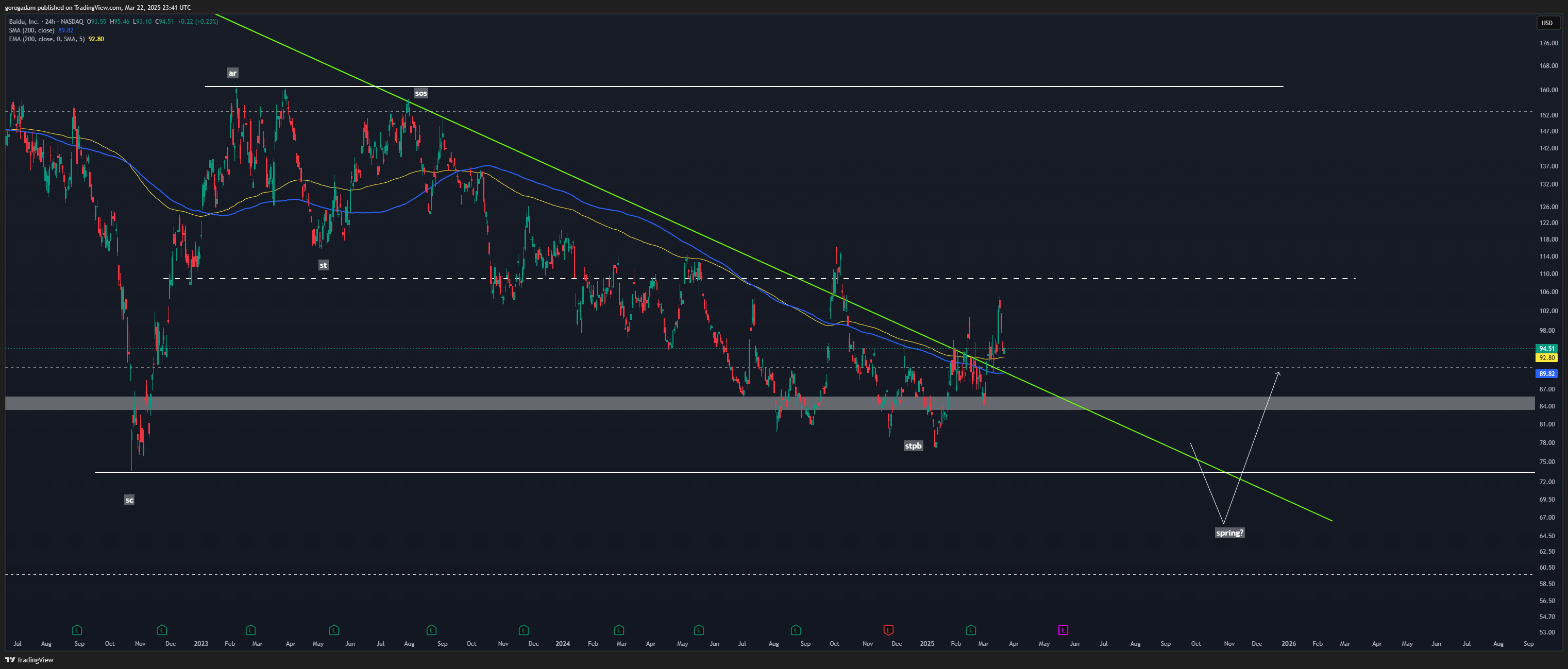 Ez a 84$-os támasz egy deep value szint, ha valaki be akar vásárolni belőle nagy szereplőként, akkor jó eséllyel itt teszi. Eközben felismerhető egy kb 2 éves akkumuláció a fehér zónával jelölve.