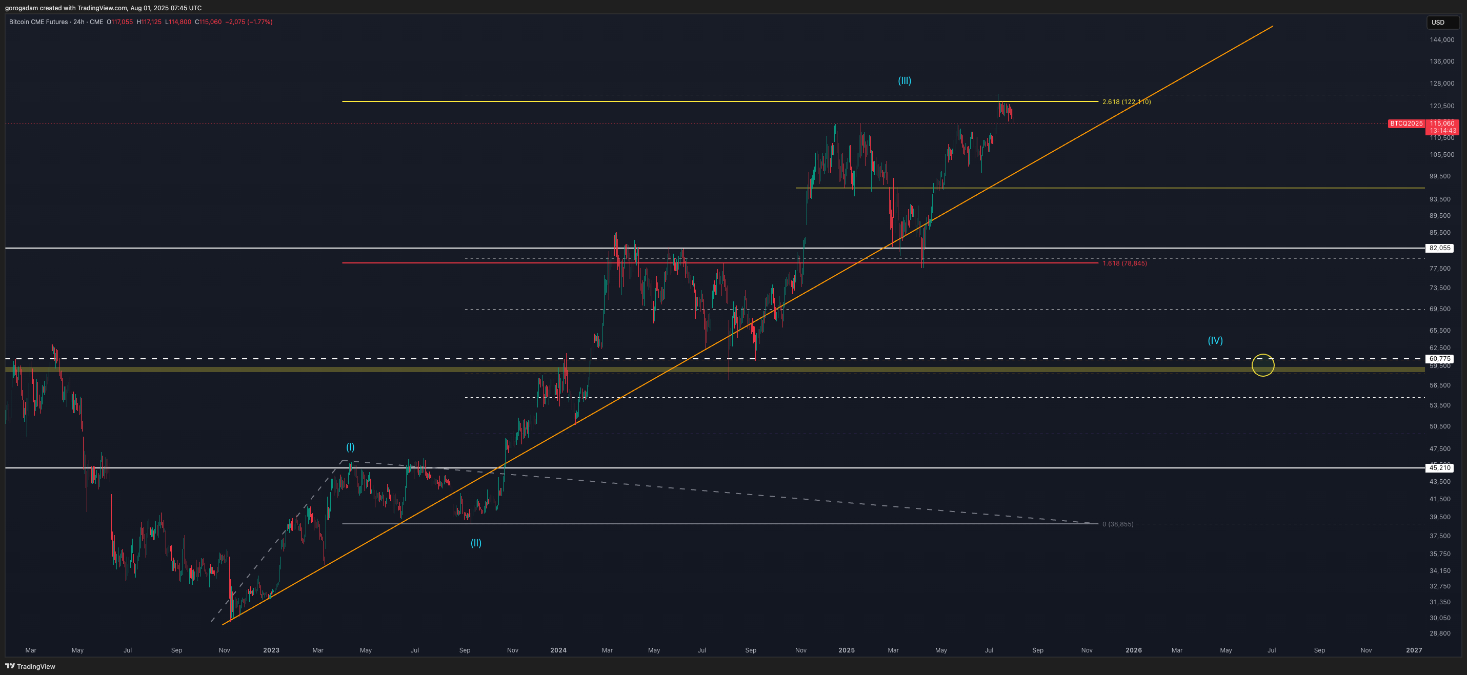 A BTC1 chart elérte log charton a 2.618-as extenziót, és ezzel szerintem megvolt a csúcs.
