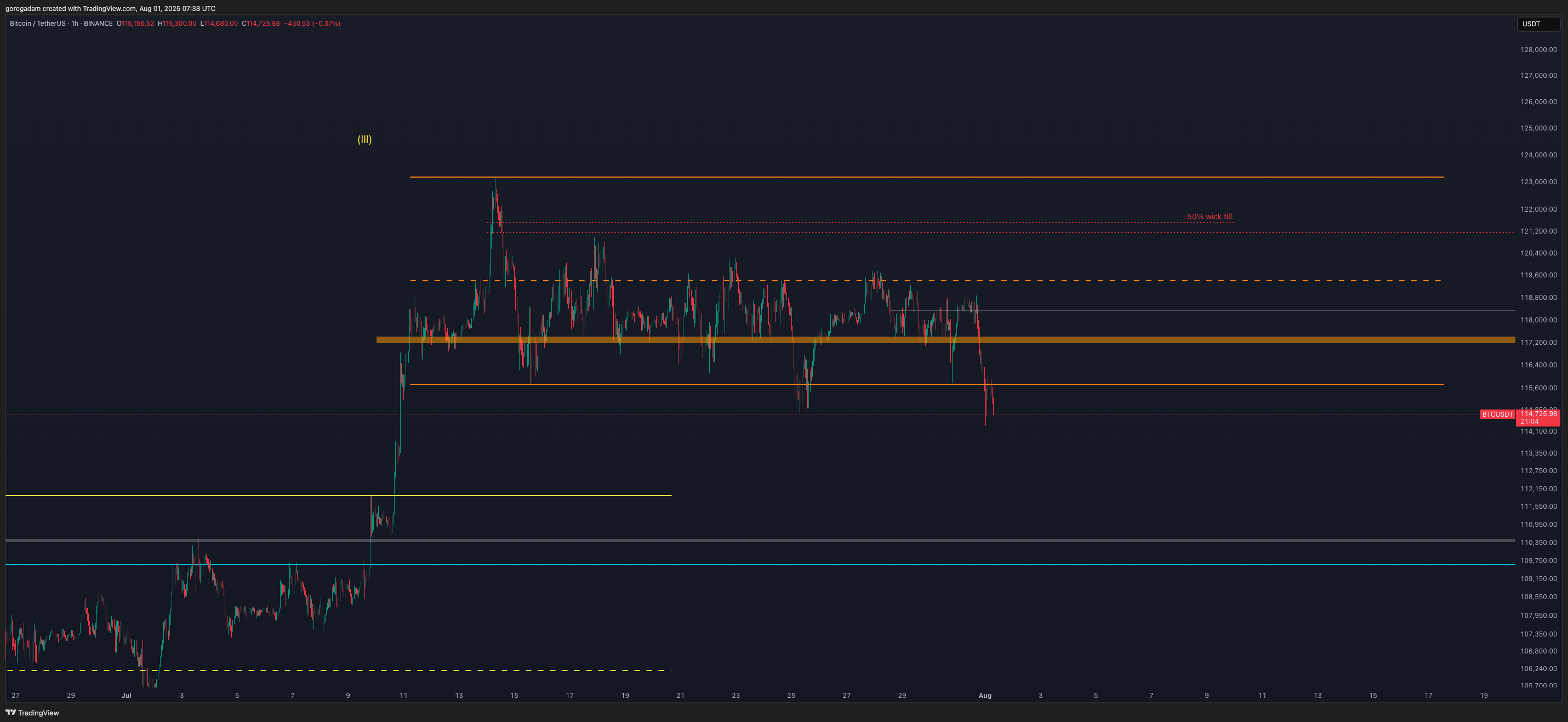 B-setup (trenddel szembeni): a 117 200-as szint visszatesztje a reakció alapján jó short lehetőség lehet, illetve minden korábbi aljpont elvesztése esetén egy folytatólagos esés várható