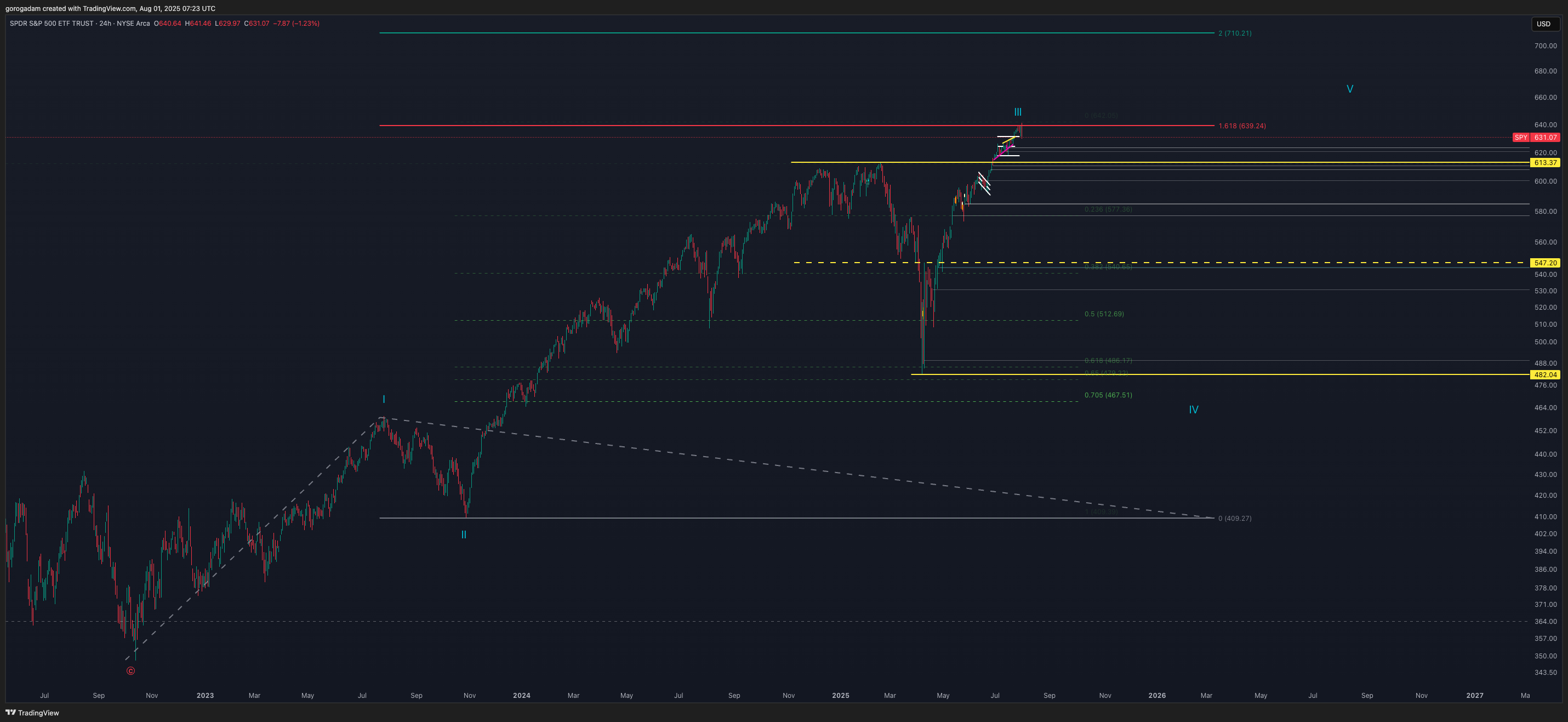 Ilyen viselkedést hosszú ideje nem láttunk, és pont most érte el log charton az 1.618-as extenziót a SPY (az S&P 500 ETF verziója), normál charton pedig a 2-es extenziós szintent (mindkettő gyakori célár egy harmadik hullámnak).
